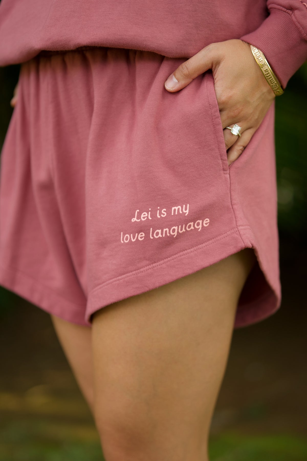 Inspired by the '70s and the "dolphin shorts" trend, this style is fun and flattering! Our Hilo Shorts have a slight A-line shape and curved hems. They pair perfectly with our Sweatshirts to create a complete comfy and classy lounge set. You will also find our signature saying, Lei is my love language printed on the leg.