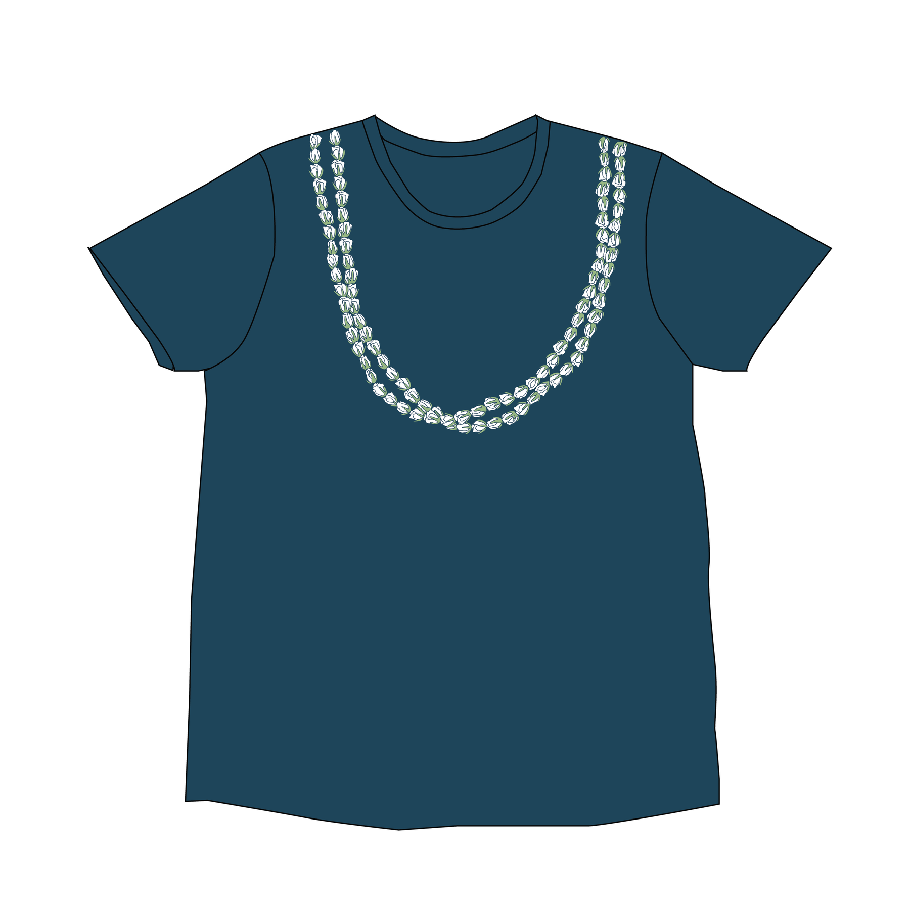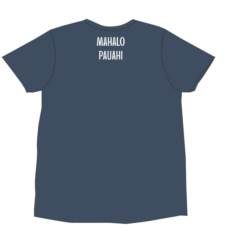 Inspired by the colors of Kamehameha Schools, our Lei Lokelani is white in contrast with the Navy tee. Printed on the back are the words "Mahalo Pauahi".