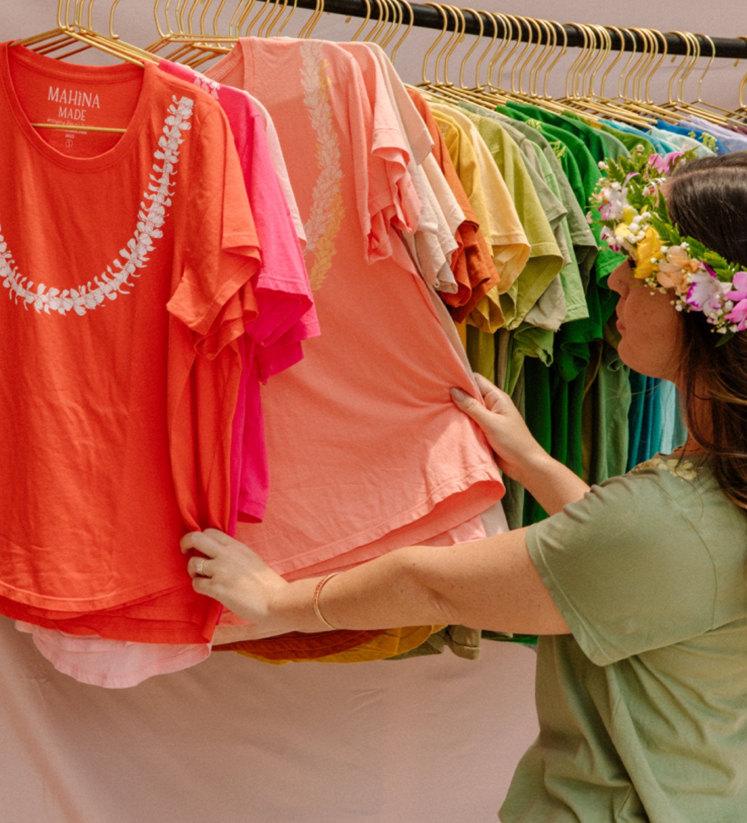 Since then, MahinaMade has become known for their lei tees that feature over 10 different beloved lei. Each tee is fully custom made in the USA from raw cotton all the way to the finished product. We are so proud to know there are over 50,000 lei tees (with more coming) bringing joy, culture, and warm memories to people around the world.